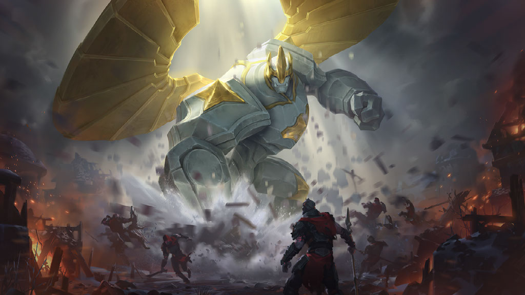 Galio es el vigilante protector de Demacia. Aunque su poder es limitado, otorga vida adicional a sus aliados y usa la nueva palabra clave Formidable para aprovechar su corpulencia y así derrotar a enemigos enormes al usar su vida como poder.